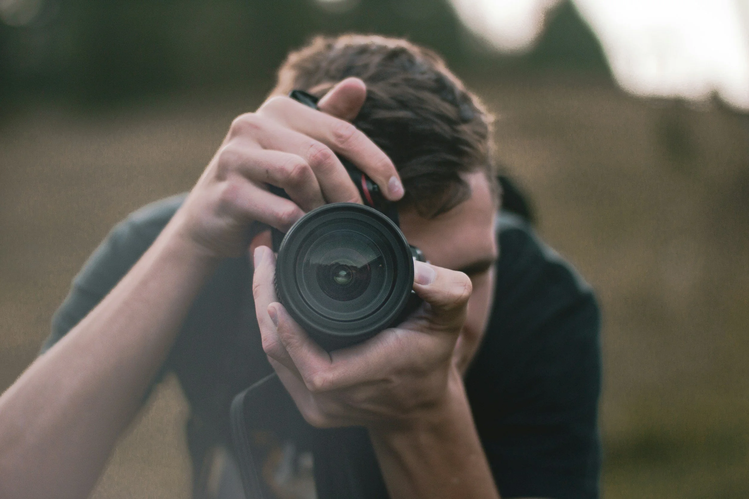 Young man taking a photograph outdoors with a professional camera with a large lens.